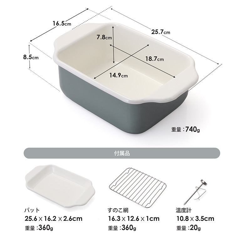 材質 | 【本体】ほうろう用鋼板 【トレー】ほうろう用鋼板 【すのこ網】ステンレス鋼 【温度計】ステンレス鋼 |
