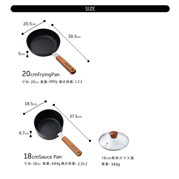 | サイズ | フライパン20cm:393×205×50(mm)/重量:560g /満水容量:1.2L スープパン18cm:375×185×97(mm)/重量:644g /満水容量:2.35L ※フライパン・鍋共通:底の厚み:3.0mm |